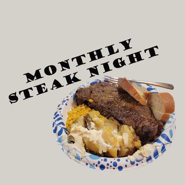 $20 Steak Dinner: Steak, Baked Potato, Vegetable, Salad, Garlic Bread, & Dessert.